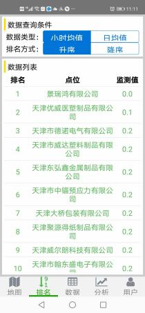 排名:排名界面可通過設(shè)置數(shù)據(jù)類型和排名方式的查詢條件,查看各點(diǎn)位的數(shù)據(jù)列表排名,包含排名、點(diǎn)位、監(jiān)測值等信息。且數(shù)據(jù)自動(dòng)按照監(jiān)測值的大小進(jìn)行排名,方便用戶直觀的查看點(diǎn)位監(jiān)測實(shí)情。