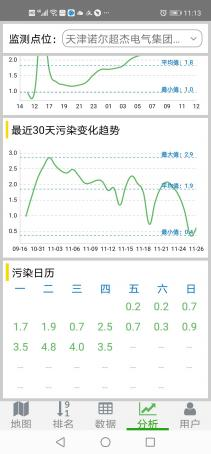 分析:分析界面可查看任一監(jiān)測點(diǎn)位最近 24 小時(shí)污染變化趨勢(shì)分析圖、最近 30 天污染變化趨勢(shì)分析圖以及污染日歷圖;其中趨勢(shì)分析圖標(biāo)記了最大值、最小值和平均值,而日歷圖則顯示所屬月份已有日期的平均濃度值。